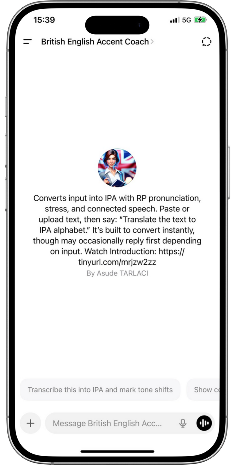 Practise Received Pronunciation (RP) in a practical way with my custom-built GPT in the ChatGPT Store, designed to help professionals improve clarity and confidence in spoken English.